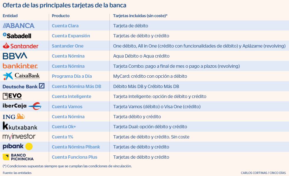El ejemplo más reciente fue el de CaixaBank y la clientela del antiguo Bankia, ahora fusionado con el primero. Hasta ahora, estos últimos habían facilitado la tarjeta de débito y crédito y se requería el uso de esta última como una de las posibles condiciones para no pagar comisiones en sus cuentas corrientes. No obstante, una vez se haya producido la integración de los productos de ambos bancos, es decir, a partir de noviembre, los clientes de Bankia dejarán de disponer de tarjeta de débito gratuita -tendrán que abonarla, si quieren, 36 euros anuales-, y la Se reducirá el costo de MyCard, una tarjeta de crédito con opciones de débito.